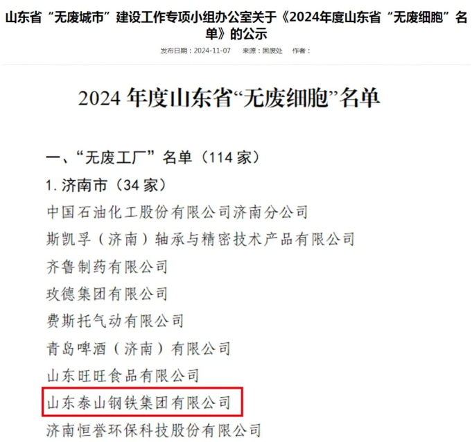 11月7日,山東省生態(tài)環(huán)境廳公布2024年度山東省“無廢細(xì)胞”名單,泰山鋼鐵集團(tuán)獲評首批省級“無廢工廠”。
